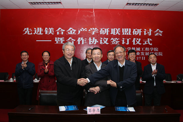 10月27日上午,先进镁合金产学研联盟研讨会暨战略合作协议签订仪式在我校举行。校长王光谦院士、上海交通大学轻合金精密成型国家工程研究中心主任丁文江院士、国家自然科学基金委工程与材料学部处长郑雁军、青海省经济和信息化委员会副主任乔弘志、青海省科学技术厅副厅长许淳、西宁市市委常委、副市长许国成、青海盐湖工业股份有限公司副总裁吴文好、上海交通大学材料学院副院长曾小勤、裸体直播 副校长李丽荣、裸体直播 院长金培鹏以及来自先进镁合金产学研联盟的20多位专家学者参加了会议。